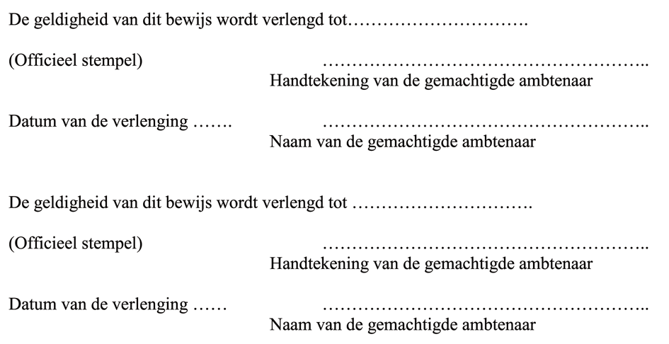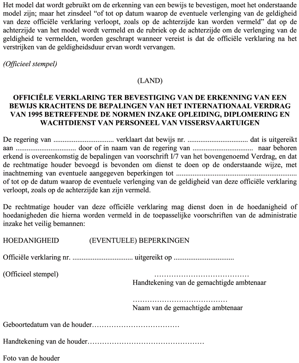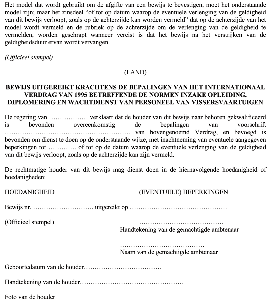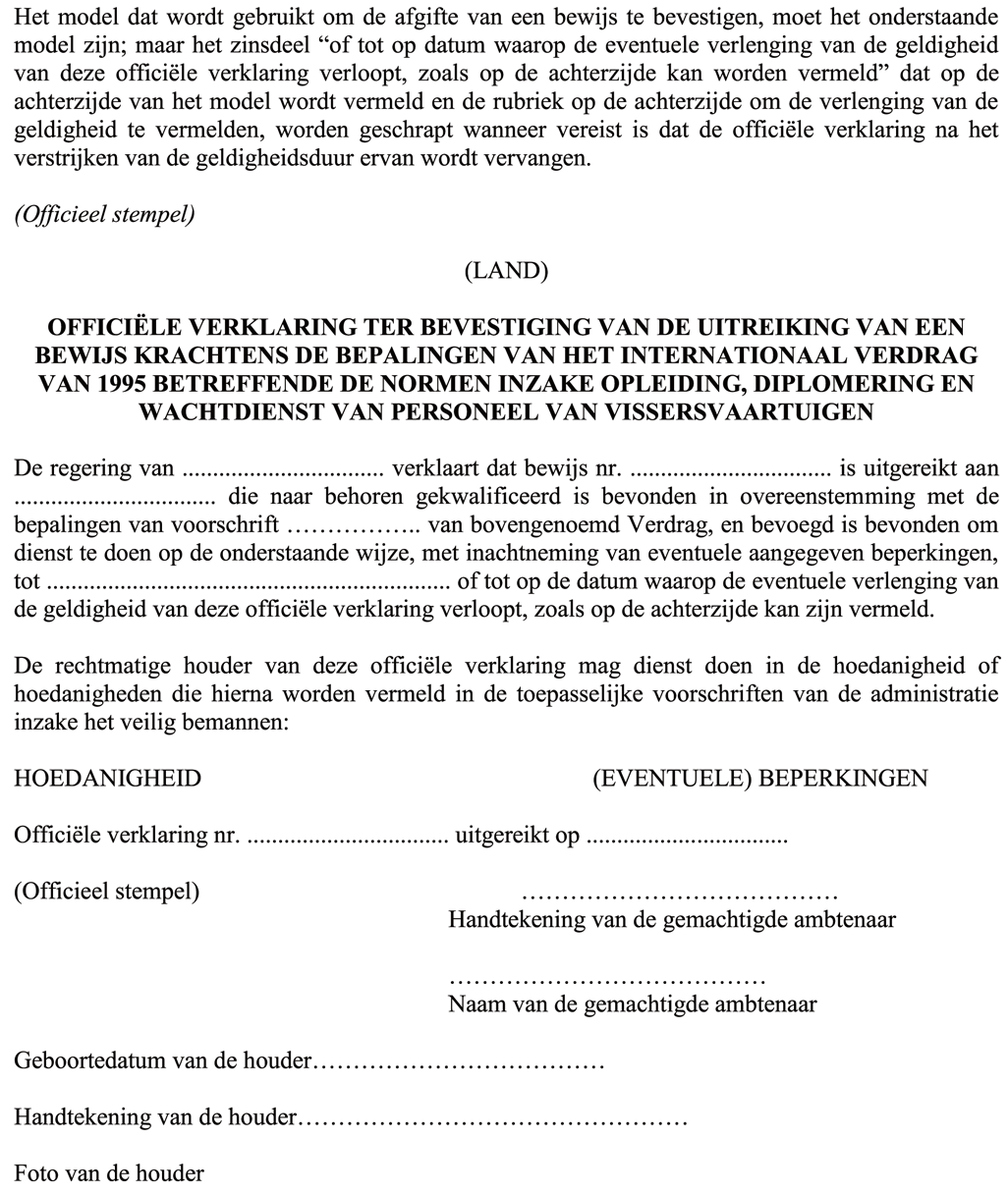 - bewijs: een geldig document, met gelijk welke benaming, dat is afgeleverd of erkend overeenkomstig de bepalingen van het Verdrag en dat de houder ervan het recht geeft de functies te vervullen die in dat document worden vermeld of worden toegestaan door de nationale regelgeving;
